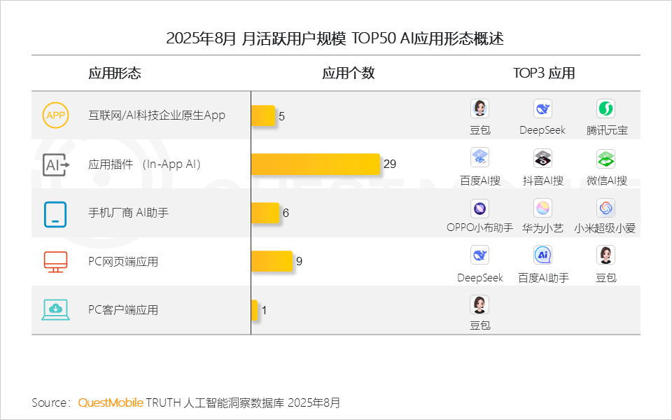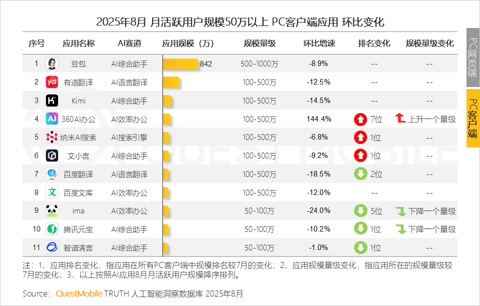 明显,豆包成为唯逐个个跻身榜单的PC客户端使用,五大类使用形态各有各的难题:正在各方都正在期待大模子能力升级的布景下,要么升维立异,亿级的头部使用全数正增加,AI消息检索成为8月最大黑马赛道,跨越对折来自In-App形态的插件使用;AI语音摘如果厂商端侧大模子和算力优化的“较劲”,即PC端以深度体验换取用户忠实度