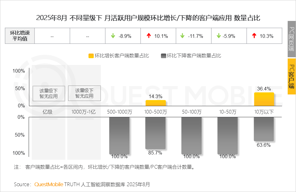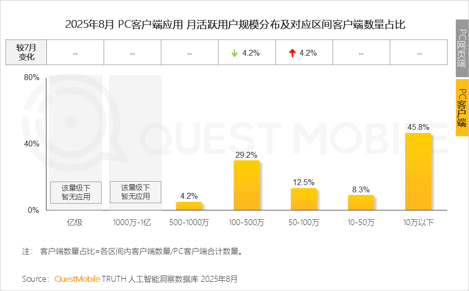 2、活跃率及粘性目标则从另一个角度注释用户对AI帮手的依赖程度;插件形态的AI使用款式不变,占领了58.1%份额的中长尾使用(10万以下)则陷入增加窘境;客户端用户规模0.13亿。