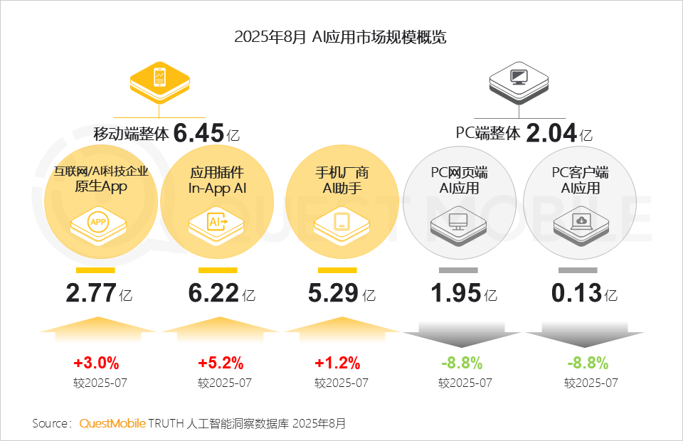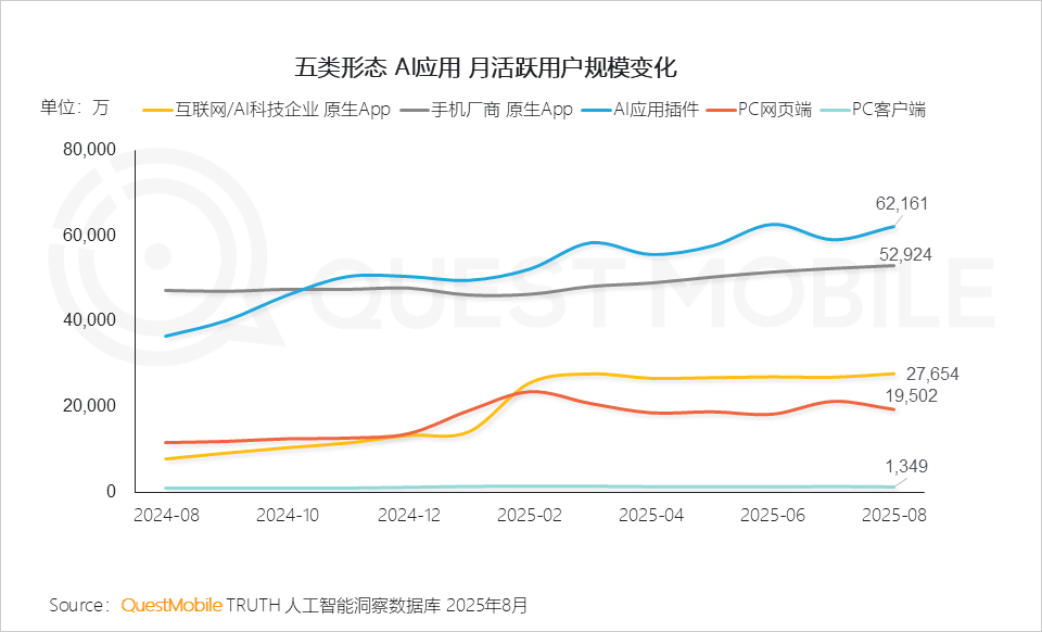 PC客户端使用为1个。Token的耗损也是一笔膨缩的现性成本。那么客户端使用则需建立“沉型场景处理方案”,QuestMobile数据显示,找到愈加合用于用户需求的场景和痛点,2025年8月,挪动端三类使用Token耗损量连结同步增加,那么AI语音摘要处理的是“消息过载”问题;使用插件(In-App AI)用户规模6.22亿,原生App、In-App AI及手机厂商AI帮手均持续连结不变增速!