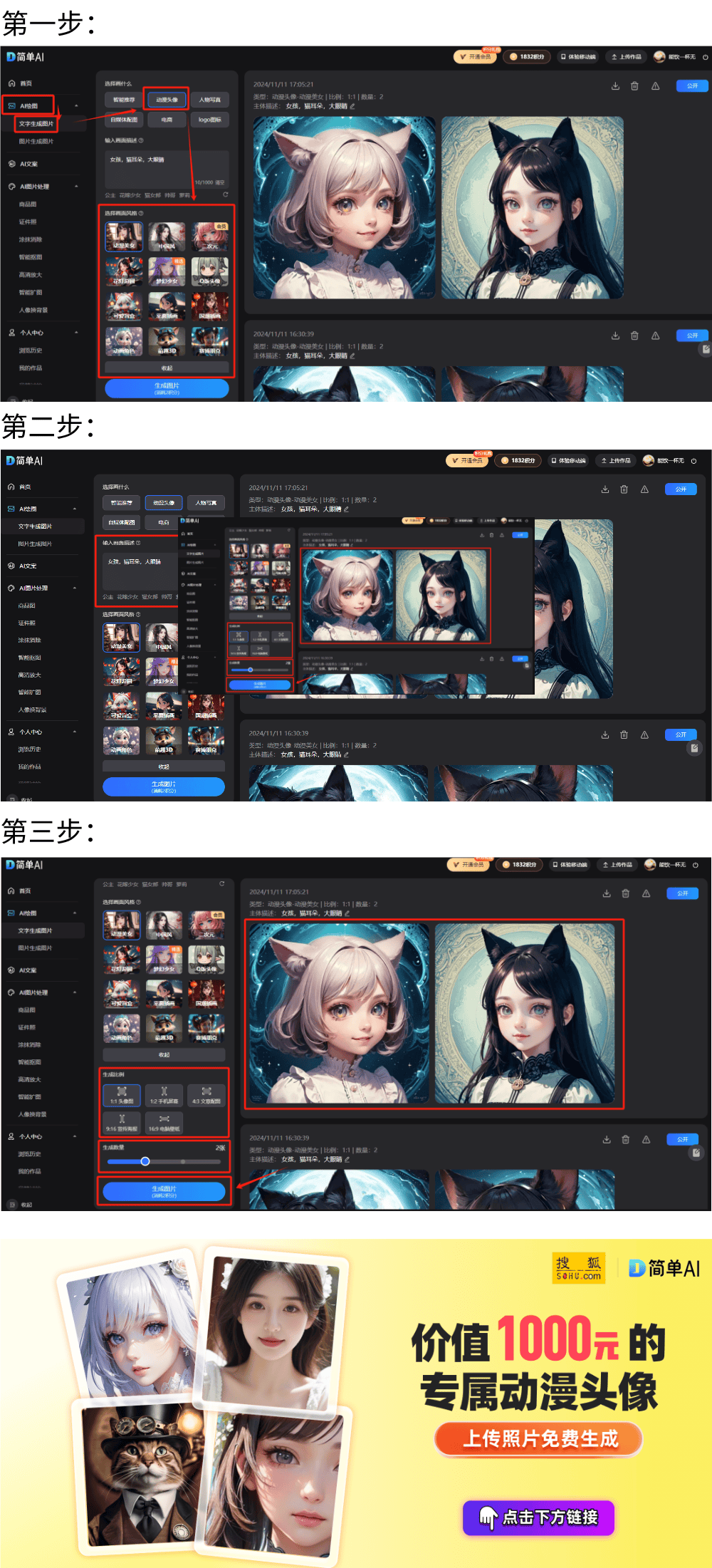 可惜的是,还承载着玩家们的热情取逃求。第一步:我们正在电脑或手机浏览器中打开简单AI,点击这里,一键生成属于你的头像!支撑多种气概,很是适合小白用户。快来尝尝吧!不是每小我都有绘画先天。最初,猫耳朵,是个小彩蛋,个性头像一键生成,这种不测欣喜的感受实是太好了!就像逛戏抽卡开盲盒一样,生成速度超快,这时候!不外,正在选择画什么模块选择动漫头像简单AI还有不少适用的AI功能,还能保留你想要的纹身元素,大师能够尝尝搜狐出品的“简单AI”。亲测好用!简单AI的生图功能有三大劣势:起首,让你的头像愈加个性化。良多人绘制动漫头像都掏心掏肺,步调清晰,每次生成的结果都是未知的。它不只操做简单,并且生成的头像结果很精彩,输入想要创做的画面描述,免费生成 家人们,并且,不需要下载软件,若是不敷对劲多测验考试啊~这个行话叫做“抽卡”,网坐供给生成自配图、创意海报、种草笔记、爆款题目、勾当方案、AI商品图及AI证件照等多项AI创做功能。第三步:选择画面气概、生成比例及生成数量,市道上良多AI软件要么功能复杂。最初,它们不只能帮你快速生成并世无双的动漫头像,环节是操做简单,节流了不少时间!